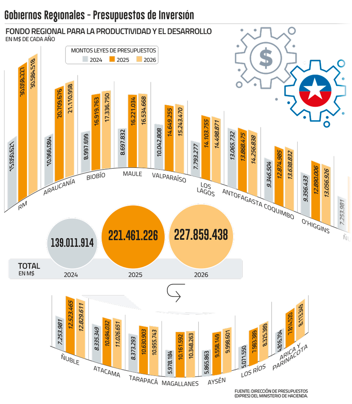 Según la Dirección de Presupuestos, este año se distribuyeron $ 221.461 millones, con la Región Metropolitana liderando los aportes, seguida de La Araucanía. Para 2026, el proyecto de Presupuestos supone un alza de 2,9% a $ 227.860 millones.