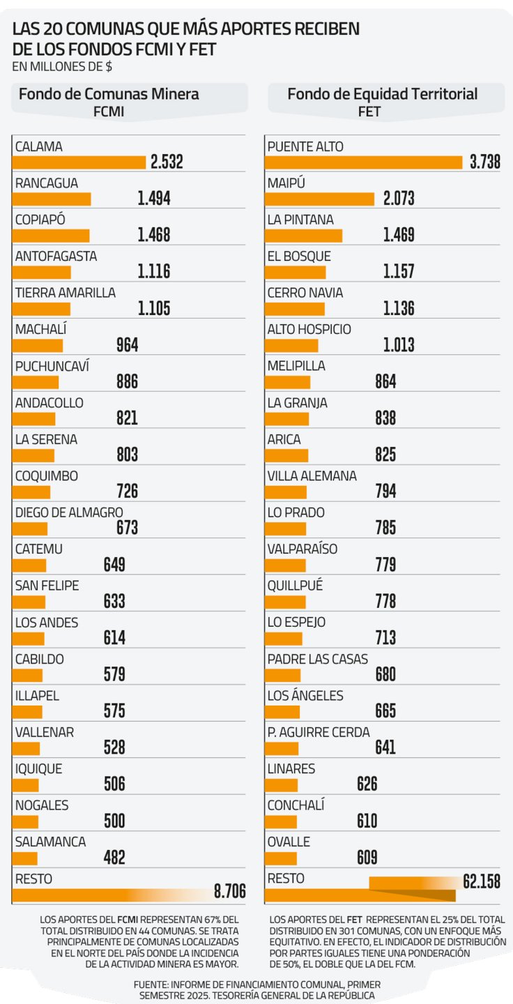 La información más actualizada sobre la distribución considera el primer semestre y fue informada por la Tesorería General de la República. En ese lapso, la suma de estos nuevos aportes ($ 109.313 millones) subió 8,5% los recursos para municipios. Además, los primeros lugares, Puente Alto y Calama, se mantienen si se compara con la distribución del Fondo Puente en 2024 (ver infografía).