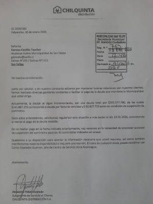 El conflicto quedó expuesto tras la filtración de una carta oficial enviada por la empresa a la alcaldesa Carmen Castillo, fechada el 16 de enero de 2026. En la misiva, se notificó que, de no regularizarse el pasivo, se verán en la “necesidad de concretar acciones de suspensión del suministro para 43 suministros”.