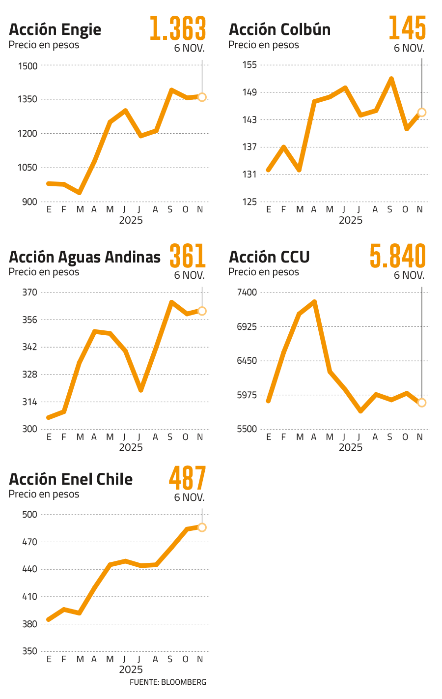 En BICE Inversiones señalan que, pese a una corrección mensual de -5,9%, el papel acumula un retorno de 17,4% en lo que va del año, reflejo de su consistencia en dividendos y resultados. Agregan que su perfil conservador la convierte en una opción habitual para fondos institucionales que buscan baja beta y correlación limitada con el ciclo económico.