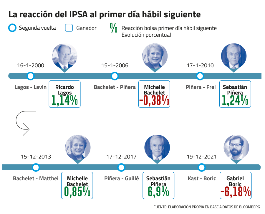 En contraste, la victoria de Sebastián Piñera en 2009 implicó una fuerte depreciación del peso, llevando al valor de la divisa a subir $30 en dos semanas, resultado de un reacomodo de expectativas.