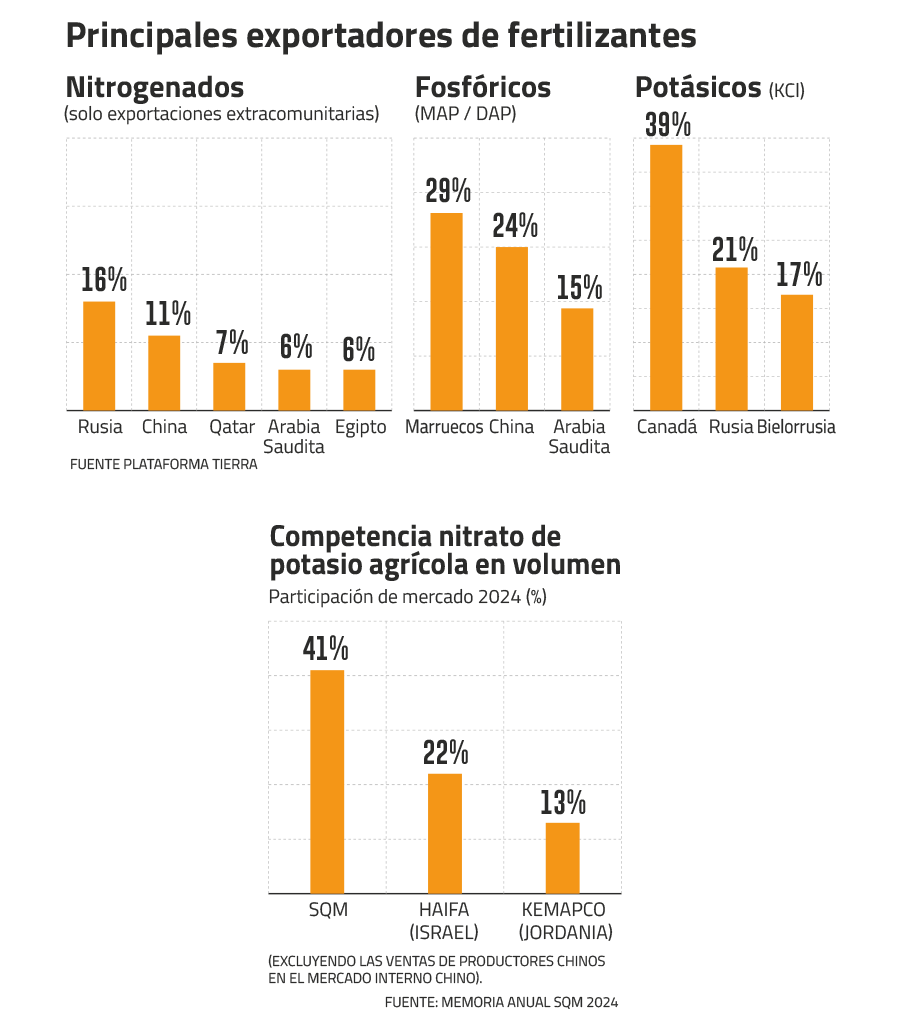 En esta crisis, Chile en parte se ve beneficiado. SQM, productora de nitrato de potasio, aparece mejor posicionada frente a sus competidores Haifa (Israel), Kemapco (Jordania) y productores chinos. La compañía chilena es el principal productor mundial de nitrato de potasio, con más del 40% del mercado global, un segmento que representa cerca de un millón de toneladas a nivel mundial.