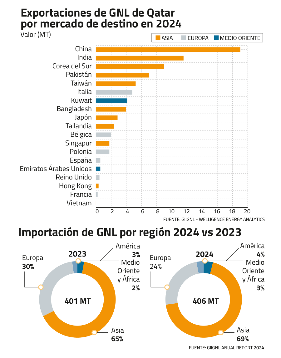 En el caso específico del GNL proveniente de Catar, ambos países también lideran las compras. En 2024 China recibió cerca de 19 millones de toneladas de GNL catarí, mientras que India importó alrededor de 11 millones de toneladas.