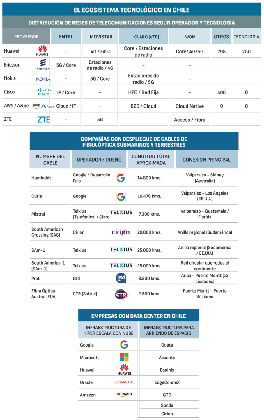 La presencia china es particularmente visible en el segmento móvil. Operadores como Movistar Chile, ClaroVTR y WOM Chile desplegaron infraestructura en 4G y 5G con una presencia significativa de compañías chinas como Huawei y ZTE en distintas capas de la red, desde acceso radioeléctrico, routers y transporte de datos hasta equipamiento asociado a los sistemas de nueva generación. De esta manera, Huawei se consolidó como uno de los principales proveedores tecnológicos del país en el marco del despliegue de redes 4G en 2013, con participación en tres de los cuatro operadores nacionales.
