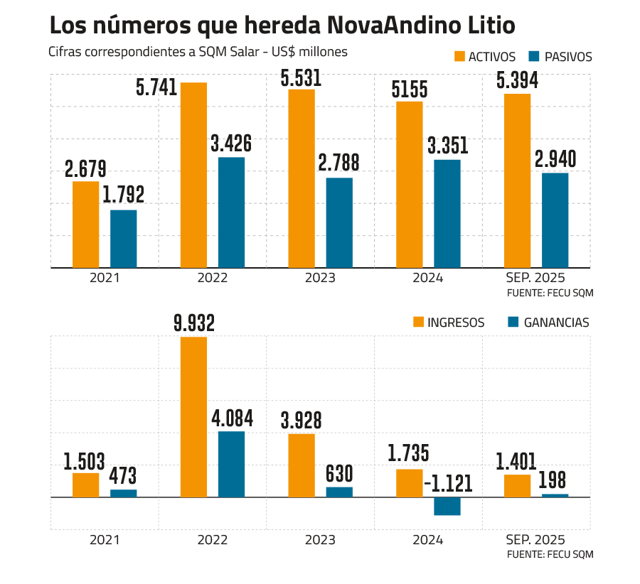 Al cierre de septiembre de 2025, la filial acumulaba activos por US$ 5.394 millones y pasivos por US$ 2.940 millones. NovaAndino Litio tendrá entre sus activos la Planta Química de Litio Carmen, ubicada al este de la ciudad de Antofagasta —la mayor refinería de litio del planeta—, además de la Planta de Litio Dixin en China, entre otros.