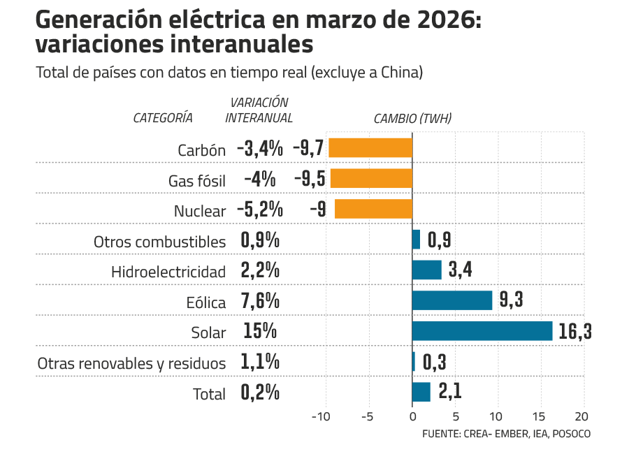 A diferencia de crisis anteriores, el retorno masivo al carbón no se materializó. Datos del Centre for Research on Energy and Clean Air (CREA) muestran que en marzo de 2026, fuera de China, la generación eléctrica a partir de carbón y gas cayó cerca de 4% interanual, mientras que la solar creció 15% y la eólica más de 7%, absorbiendo el ajuste del sistema.