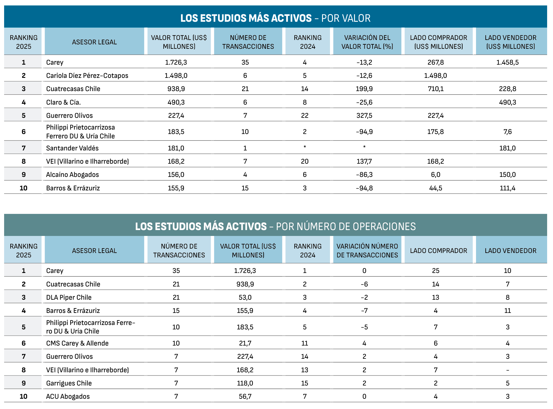 De acuerdo con el informe de TTR Data, Carey encabezó el ranking de asesores legales por valor total transado en 2025, con operaciones que alcanzaron US$ 1.726 millones, distribuidas en 35 transacciones.