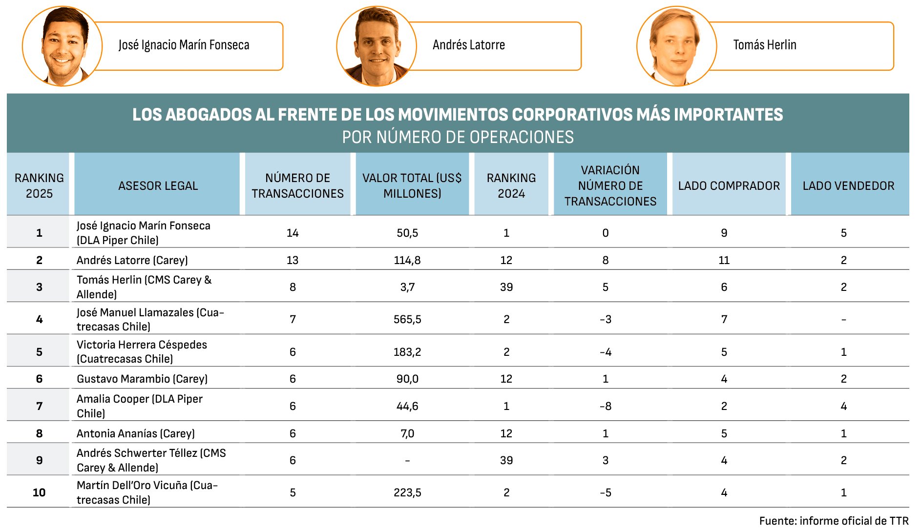En términos de actividad (número de transacciones), el ranking de abogados más activos fue encabezado por José Ignacio Marín Fonseca (DLA Piper Chile), con 14 operaciones, seguido por Andrés Latorre (Carey) con 13 operaciones y Tomás Herlin (CMS Carey & Allende) con ocho operaciones en el periodo.