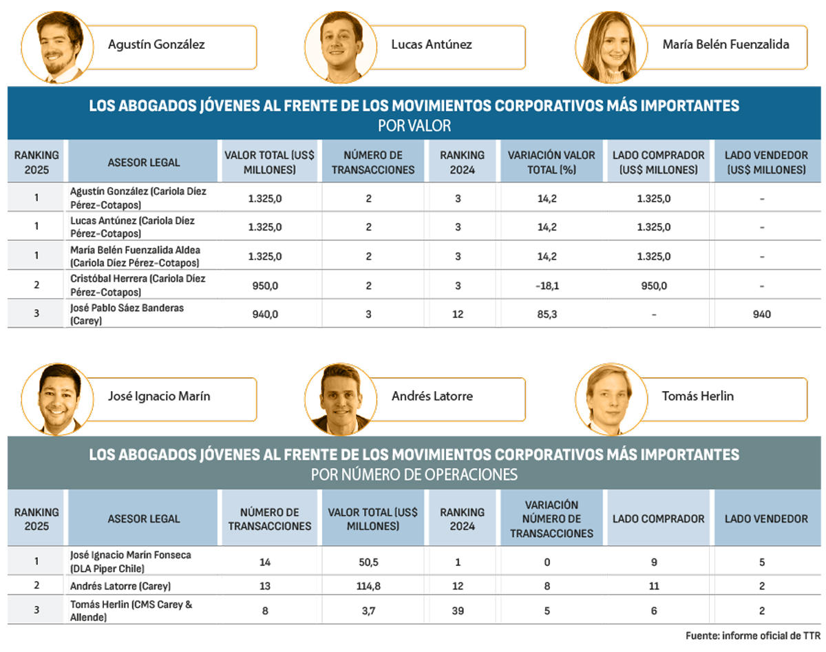El informe también puso el foco en los abogados jóvenes que participaron en las operaciones más destacadas del mercado chileno. En el ranking por valor total, el liderazgo estuvo concentrado en abogados del estudio Cariola Díez Pérez-Cotapos. En el primer lugar se ubicaron Agustín González, Lucas Antúnez y María Belén Fuenzalida Aldea, quienes encabezaron el listado con operaciones por US$ 1.325 millones cada uno. Más atrás se posicionó Cristóbal Herrera, también del mismo estudio, con transacciones que sumaron US$ 950 millones. En el tercer lugar quedó José Pablo Sáez (Carey) con un total de US$ 940 millones.