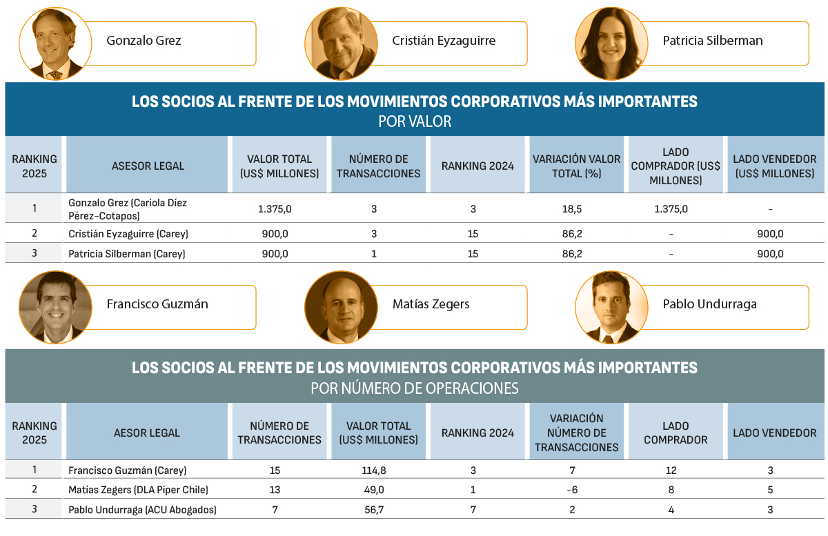 El ranking enumera a los socios que lideraron el mercado chileno de fusiones y adquisiciones durante 2025, considerando tanto el valor total de las operaciones asesoradas como el número de transacciones en las que participaron.
