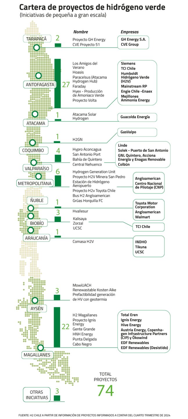 Pero las perspectivas han decantado a tal punto que ahora se perfila –en el mejor de los casos– que la industria partiría con sólo un megaproyecto de más de US$ 10 mil millones, y en plazos mayores de desarrollo, indicó el director ejecutivo de H2 Magallanes, Salvador Harambour (ver entrevista relacionada).