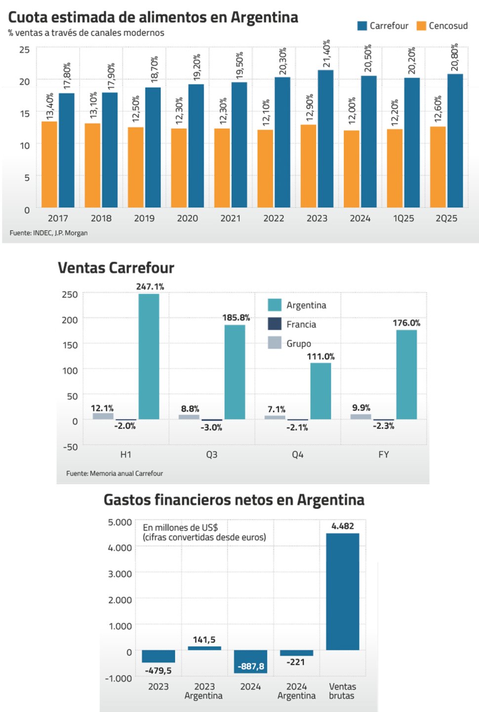 Por su parte, Cencosud tiene una presencia más limitada, con 307 locales bajo las marcas Jumbo, Disco, Vea, Makro y Basualdo. No obstante, ya concentra el 12,6% de las ventas del sector, frente al 20,8% de Carrefour, según datos de JPMorgan.