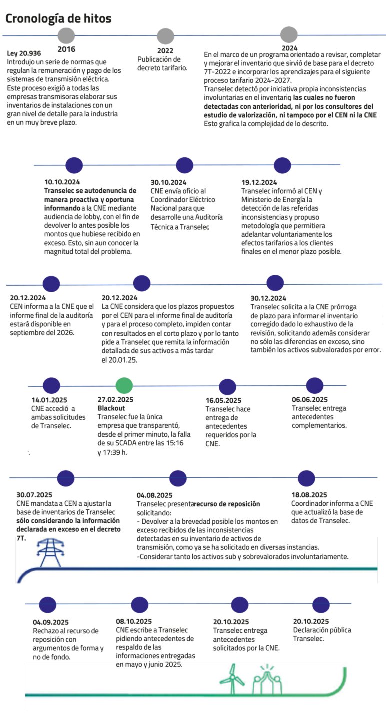 La historia de la autodenuncia de Transelec tiene varios hitos. La génesis de esta crisis se remonta a la Ley Eléctrica de 2016. Esta normativa creó un registro centralizado y gigantesco de activos administrado por el Coordinador Eléctrico Nacional. El desafío para empresas con vastas infraestructuras, como Transelec –que gestiona 10.000 kilómetros de líneas desde Arica hasta Chiloé–, fue monumental.