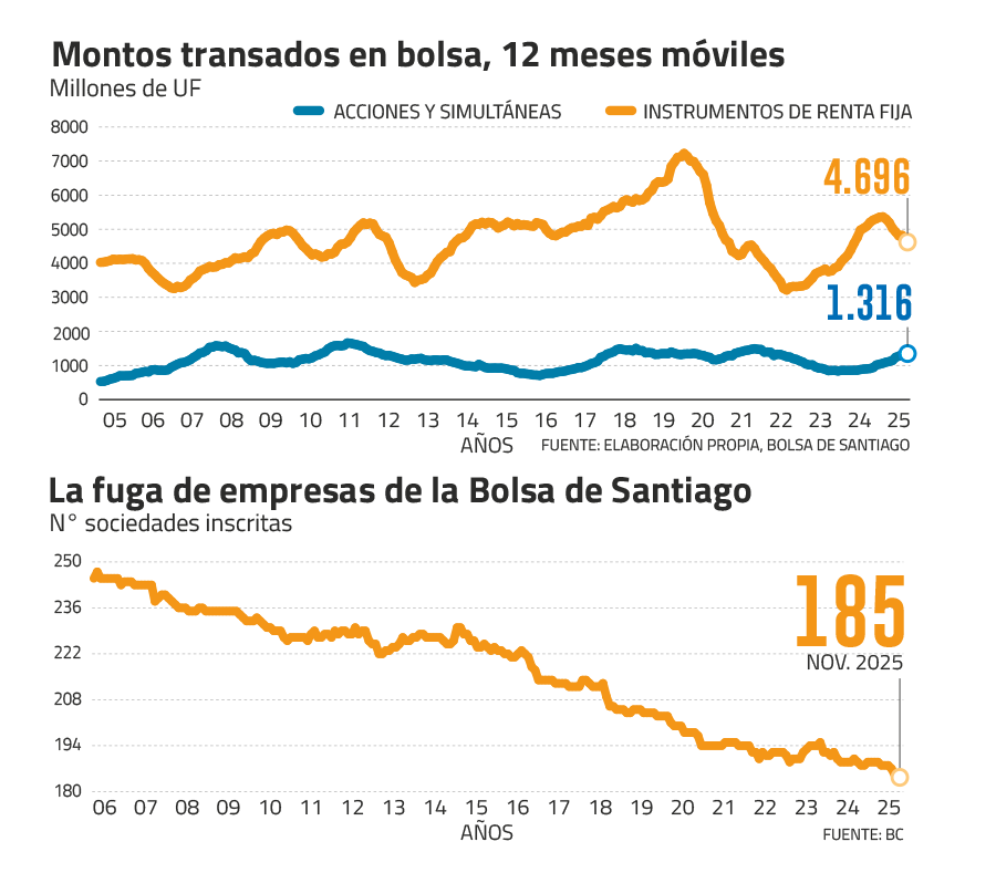 La fuga de empresas que cotizan en la Bolsa de Santiago se ha consolidado como una tendencia: en los últimos 15 años, el número de emisores ha caído un 25%. La menor profundidad del mercado es solo una de las señales que reflejan su deterioro, en un contexto donde los montos transados aún no logran recuperarse.