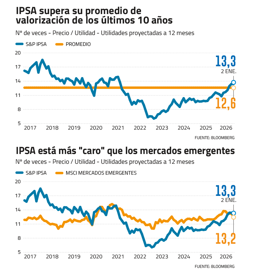 Sepúlveda coincide: “el IPSA ya no está ‘barato’ (...) el P/U hoy refleja optimismo, pero no euforia. La clave para que no se vuelva exigente es que el crecimiento de utilidades sea real y amplio, y que el mercado no tenga que volver a cobrar una prima de incertidumbre como la de años anteriores”.