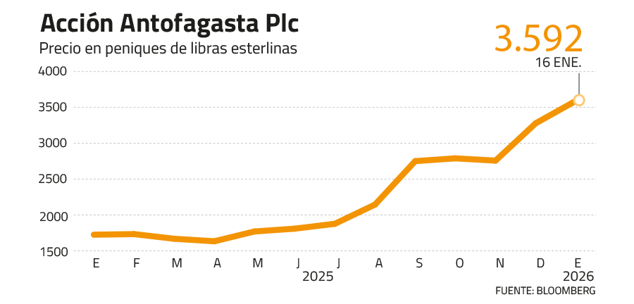 Y no solo el mercado ha puesto su mirada en Antofagasta Plc. Los medios internacionales han destacado en las últimas semanas que la compañía se está posicionando como un gigante global minero con perspectivas brillantes hacia el futuro. El Financial Times recordó que la acción llegó a su máximo histórico el pasado 12 de enero (3.573 peniques de libras esterlinas), mientras Reuters y Bloomberg han informado sobre los acuerdos de la compañía para procesar mineral en China. Incluso en España, el medio económico Expansión ha dedicado cobertura a Antofagasta Plc, citando a su acción como una de las seis inversiones para ganar en bolsa con el alza de los metales.