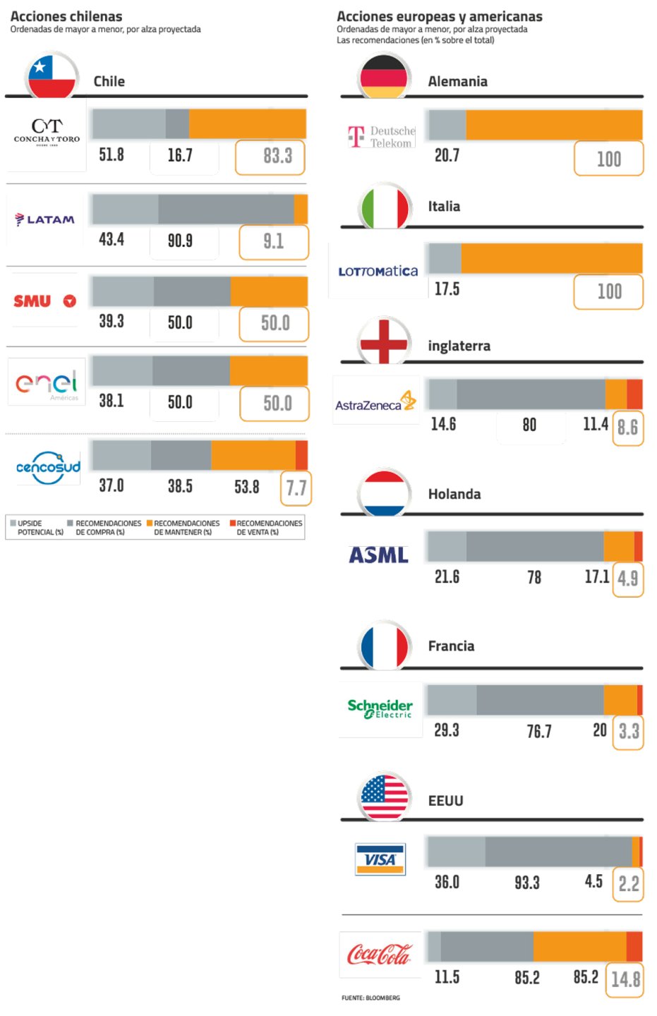 Bajo ese prisma, en el mercado identifican a cinco acciones donde conviene invertir hoy, pese a la volatilidad bursátil: Concha y Toro, Latam, SMU, Enel Américas y Cencosud.