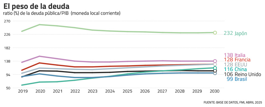 El Fondo Monetario Internacional proyecta que el déficit fiscal francés cerrará este año en 5,5%-6% del PIB, y se mantendrá en torno a ese nivel hacia 2030. Para entonces, la deuda pública francesa habrá aumentado a casi 130% el PIB, desde un 116% que se estima para el cierre de 2025.