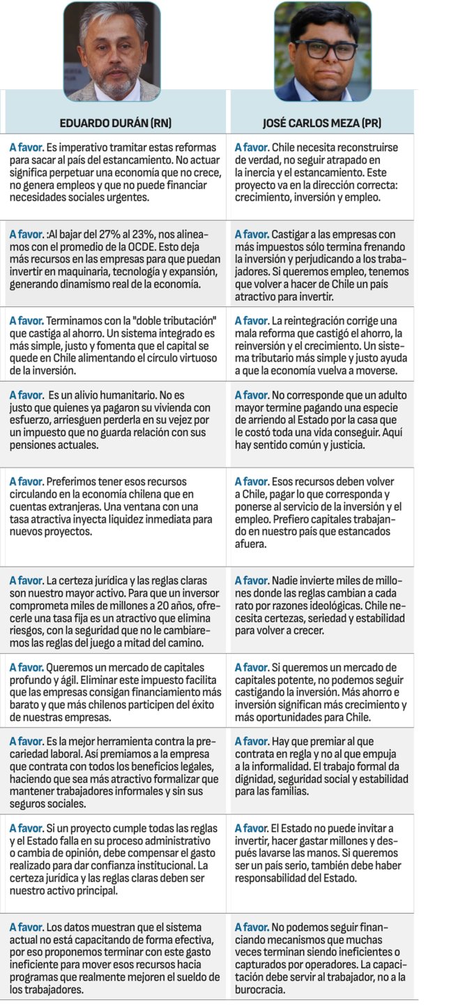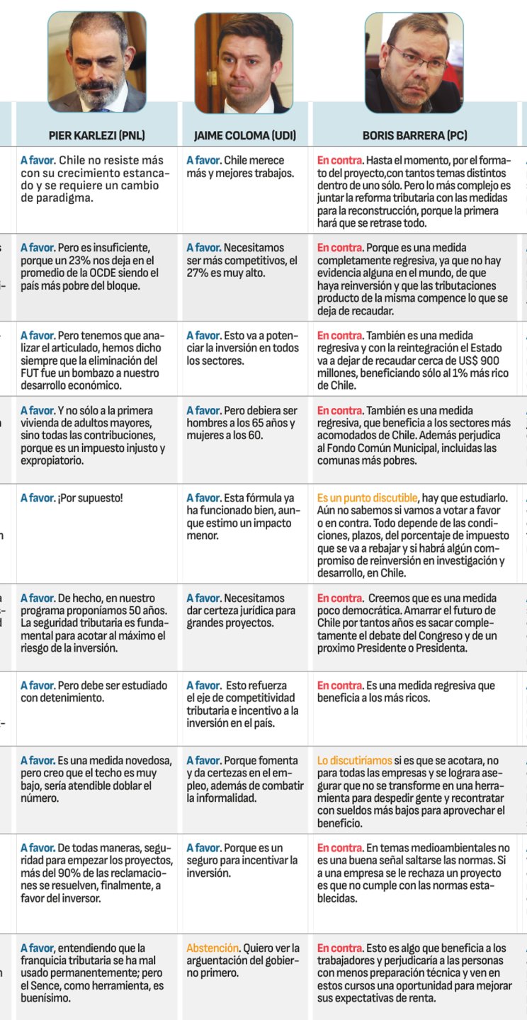 En este artículo, Señal DF intentó conocer la postura de todos los integrantes de la Comisión de Hacienda sobre algunos puntos a los que se refirieron muchos de ellos, aun antes de tener la confirmación de que estarían incluidas en el proyecto; sin embargo, tres no respondieron la encuesta, el independiente en la bancada PPD Carlos Bianchi, el representante del PDG en la instancia; Juan Manuel Valenzuela y el frenteamplista Jorge Brito (uno de cada una de las oposiciones).