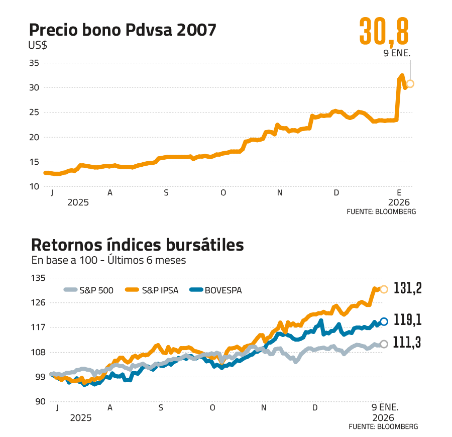 El analista de Renta Fija Internacional de Renta4 Chile, Rafael Mendoza, explicó que, pese a que “estos títulos se encuentran actualmente en situación de impago (default) desde 2017 y varios custodios no los operan debido a las sanciones, se reactivaron con fuerza esta semana”.