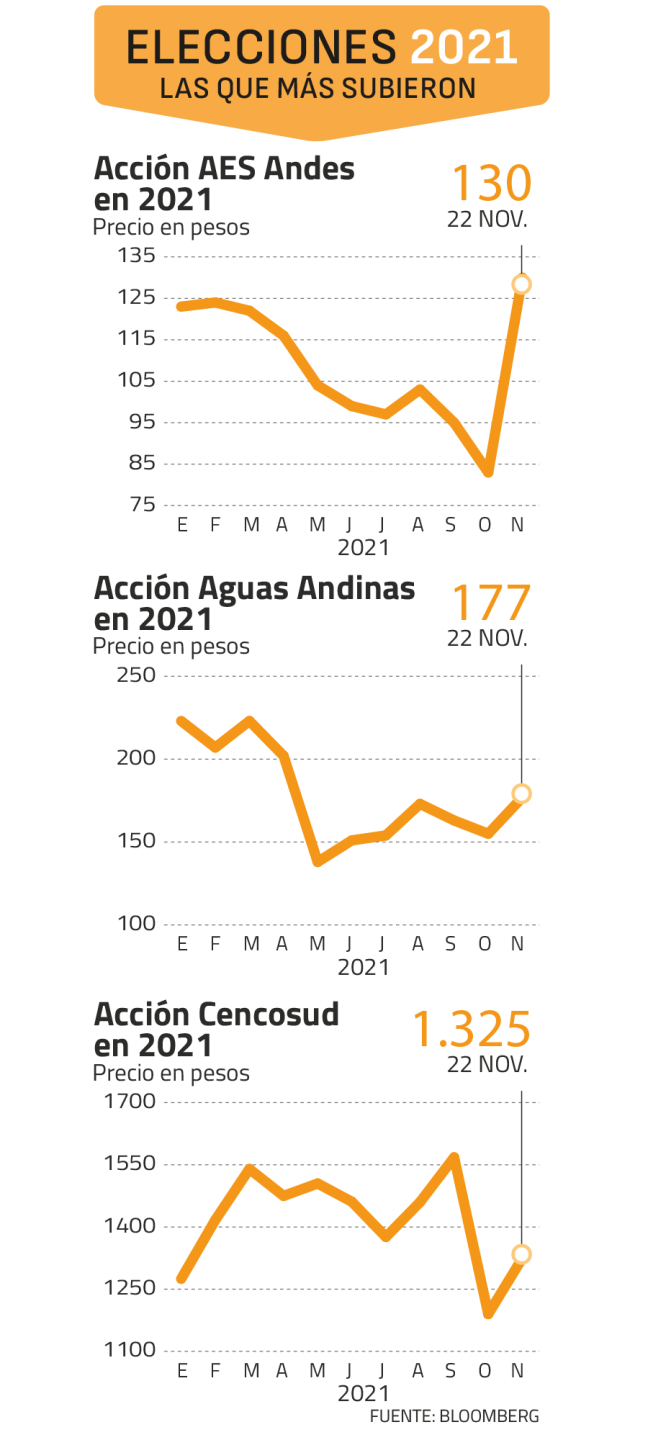 Otra acción que brilló ese día fue AES Andes. La discusión constitucional también había golpeado a las acciones de las eléctricas, principalmente las relacionadas a la intervención del Estado en materias de generación y distribución de energía. Todas las eléctricas saltaron tras la primera vuelta entre Kast y Boric, pero AES Andes destacó por sobre todas.