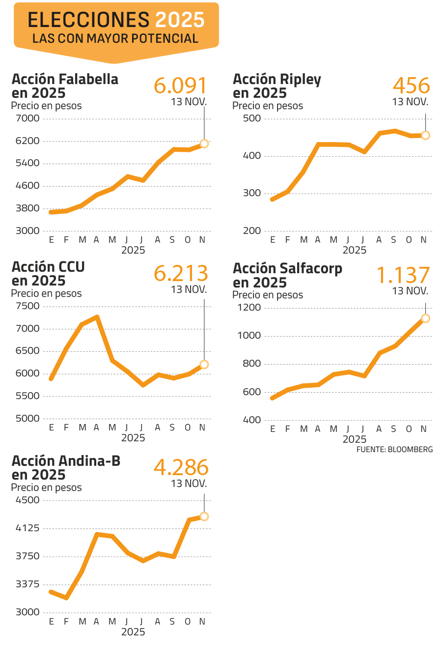 En el caso de las acciones de Falabella, llegan a la elección presidencial en un buen pie, con un Ebitda que subió 10,3% en el tercer trimestre. “Esta mejora fue impulsada por una gestión efectiva de inventarios, una mayor rentabilidad en los canales digitales y el fortalecimiento de la propuesta comercial en el segmento bancario, reflejando el foco estratégico de la compañía. Como resultado, la utilidad neta aumentó 83,9%, superando nuestras estimaciones (14,6%) y el consenso del mercado (16,4%)”, señalan desde Banchile.