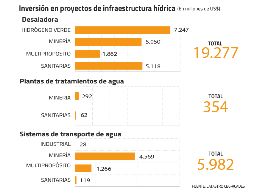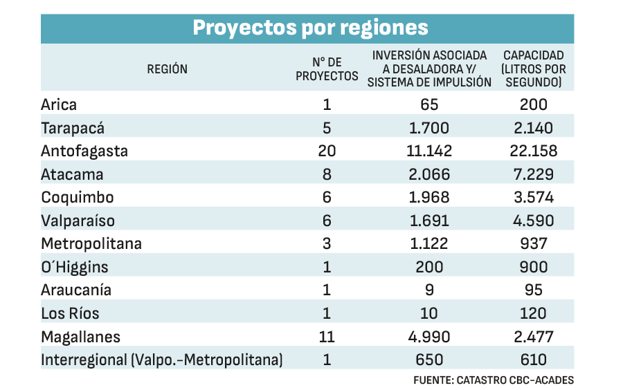 Y el balance al cierre del ejercicio recién pasado anticipa un crecimiento aún mayor. A diciembre pasado, la cartera de iniciativas en este campo en distintas etapas de ingeniería o construcción sumaba 64 proyectos que representan una inversión total estimada de US$ 25.613 millones. Así consta en el catastro elaborado por la Corporación de Bienes de Capital (CBC) y la Asociación Chilena de Desalación y Reúso A.G. (Acades) que actualizó los montos de inversión comprometidos en las iniciativas más relevantes y su estado de avance.