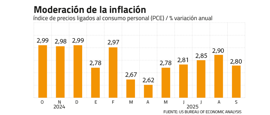 El último registro que se conoce es el de septiembre, previo al cierre del gobierno federal que afectó la recolección de datos durante octubre. En septiembre, el índice marcó su quinta alza consecutiva marcando un 2,8%. Pero tras las señales de desaceleración del IPC, el mercado espera que el índice marque su primera baja desde mayo.