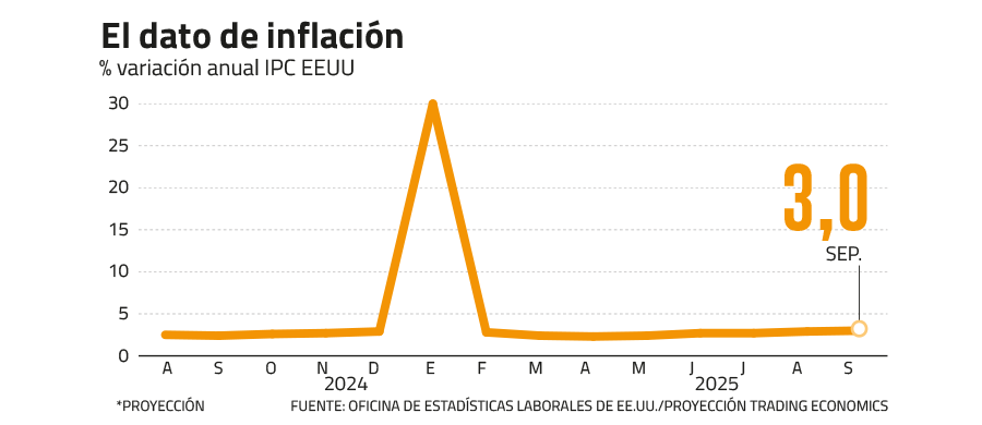 Pero tras las últimas declaraciones del presidente de la Fed, Jerome Powell, se puede decir que la atención al reporte de inflación será solo formal. El mercado está dando por descontado que la Fed avanzará con un segundo recorte consecutivo de 25 puntos base en su reunión del 29 de octubre; y con un tercero en diciembre. Powell dejó en claro que a la Fed le preocupa más las señales de desaceleración del mercado laboral, que el avance de la inflación, que habría llegado en septiembre a 3%.