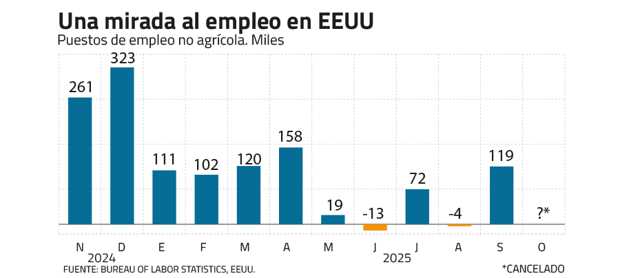 Una vez conocidos los datos, la atención girará hacia las cifras de inflación. El último registro disponible, en septiembre, mostró una inflación anual de 3%, un punto porcentual por encima de la meta de la Fed. Eso explicaría la división al interior de la Fed. En palabras de su presidente, Jerome Powell: “Todos en la Fed están de acuerdo que la inflación es muy alta, y también que el empleo es más débil. La diferencia está en cuál riesgo considera (cada uno) que es más importante”.