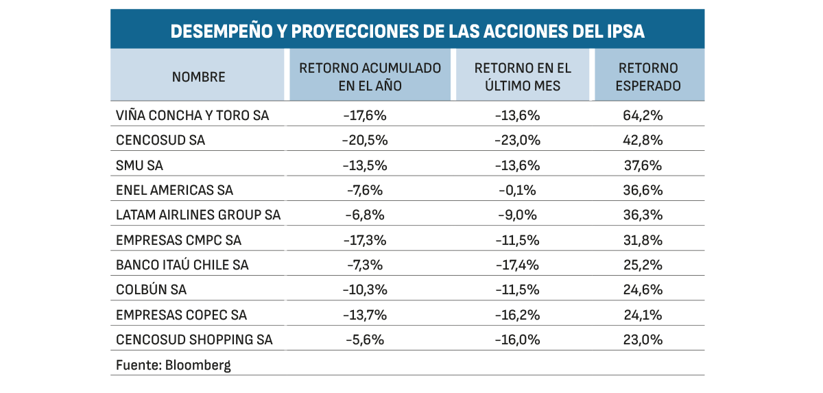 Pero tras el castigo, comienzan a aparecer oportunidades. Hoy, cinco acciones concentran los mayores retornos esperados a 12 meses: Viña Concha y Toro (62,7%), Cencosud (40,4%), Enel Américas (38,6%), SMU (37,8%), y Latam Airlines (35,7%).