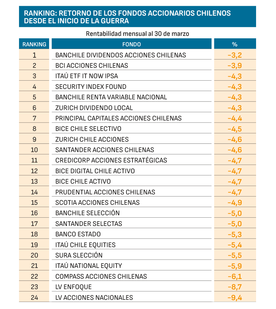 Los fondos mutuos y de inversión locales tampoco escaparon. Según cifras de RiskAmerica, dentro de la categoría Acciones Large Cap —instrumentos que invierten en las empresas de mayor capitalización bursátil—, las pérdidas llegaron hasta un 9,5% entre el estallido del conflicto y el 30 de marzo. La caída promedio entre los 24 fondos del segmento fue de 5,1%.