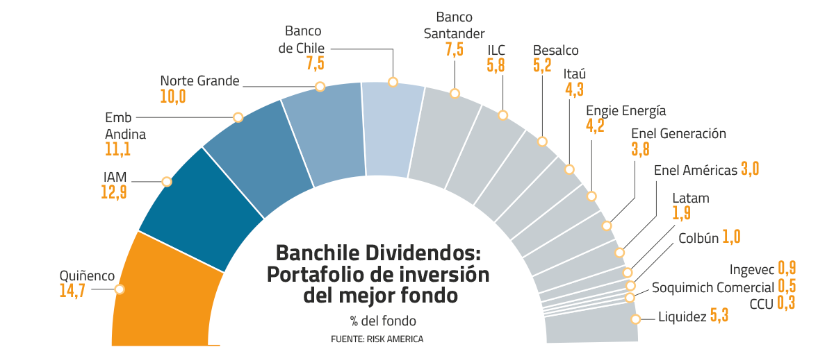 Por empresa, su mayor posición es Quiñenco (14,7% del portafolio), seguida de Inversiones Aguas Metropolitanas (12,9%), Embotelladora Andina (11,1%), Norte Grande (10%), Banco de Chile (7,5%) y Banco Santander (7,5%).