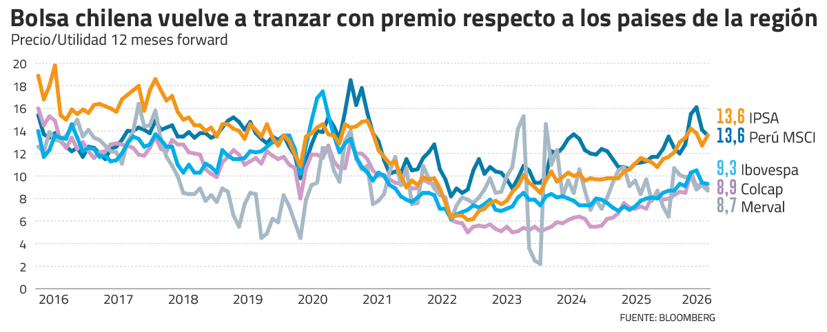 Hoy ese escenario quedó atrás: la Bolsa de Santiago transa a 13,6 veces precio/utilidad forward, en línea con Perú (13,6x) y muy por encima de Brasil (9,3x), Colombia (8,9x) y Argentina (8,7x), según datos de Bloomberg. La diferencia con Brasil supera los cuatro puntos y refleja el retorno del premio histórico que Chile había perdido tras el estallido social y los años de mayor incertidumbre política.