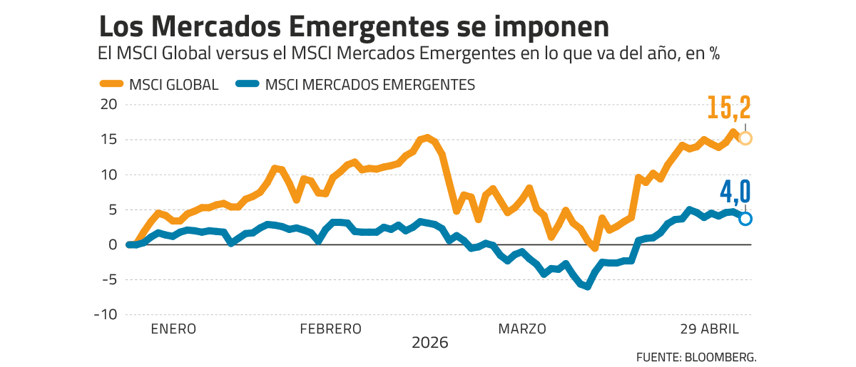 Los mercados emergentes aventajan a la Bolsa mundial en 10,07 puntos porcentuales. Esta es la mayor brecha a favor de los emergentes desde finales de febrero, antes del inicio de la guerra.
