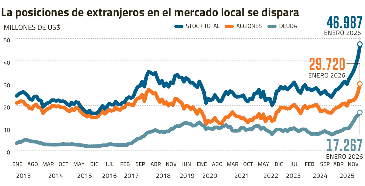 En cuanto a las apuestas en acciones, la participación de los extranjeros también ha aumentado. Pero, a diferencia de los bonos, en este caso se explica principalmente por el rally de la bolsa, que escaló un 56% en 2025. En términos de flujos, los no residentes han desinvertido US$ 2.114 millones en los últimos 12 meses.