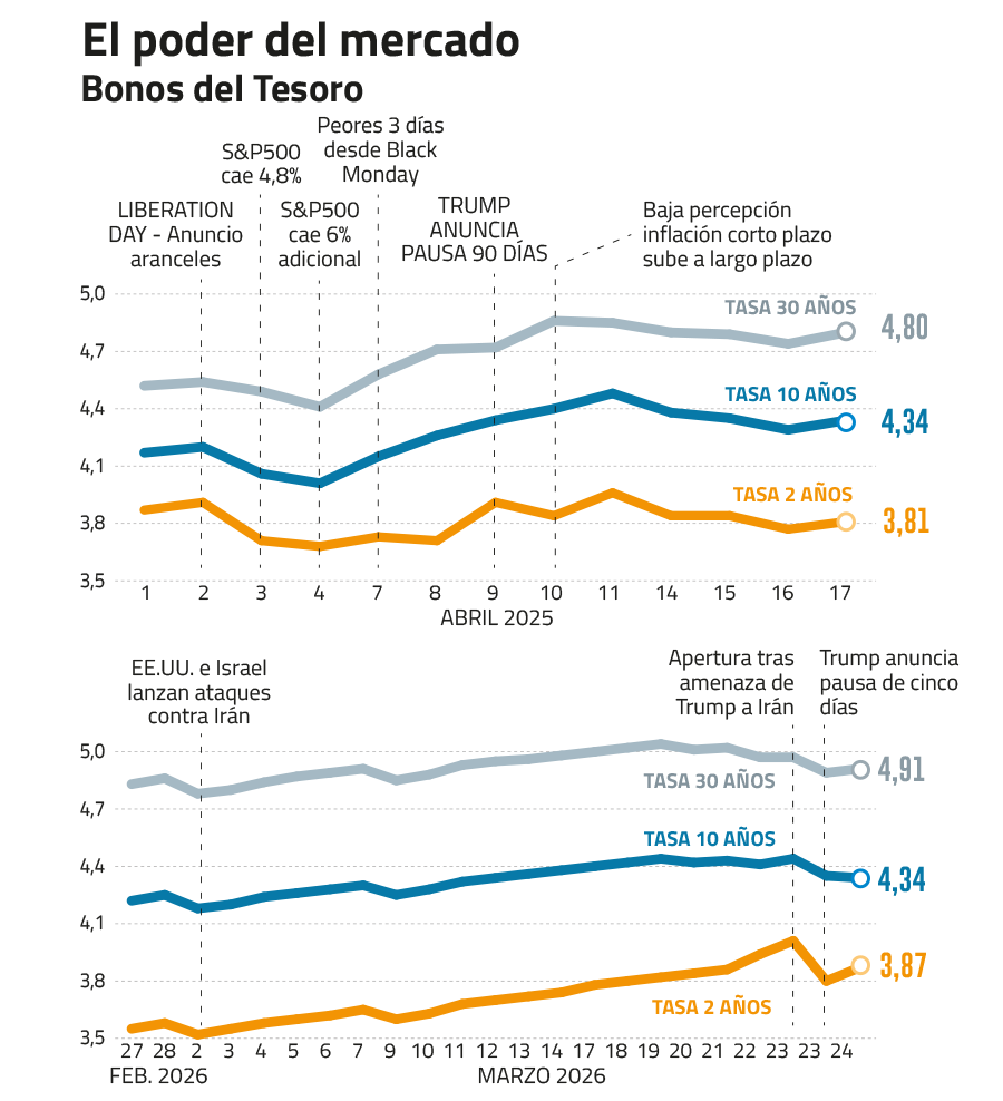 Pero la guerra en Irán muestra tres fenómenos. El primero, que es necesario una reacción cada vez más drástica del mercado para modificar la agenda de la Casa Blanca. El segundo, que más a la caída de Wall Street, la administración Trump le preocupa la inflación. Finalmente, que la falta de claridad en la estrategia en Irán parece haber roto el mantra del TACO trade.